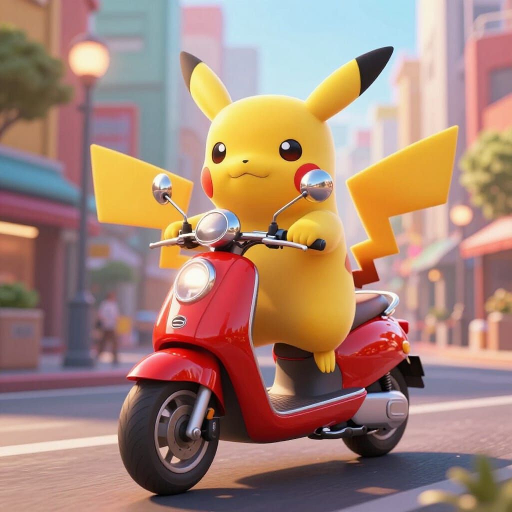 This image shows Pikachu joyfully riding a red electric scooter down a bustling city street during golden hour. Cinematic digital art with a warm, glowing atmosphere.