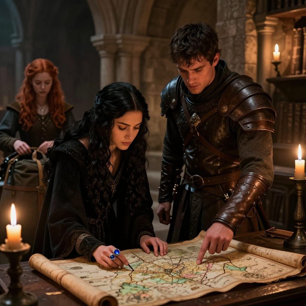 A photorealistic medieval library scene with characters Elara and Kael examining a map, while Lyra prepares for travel. Features dramatic shadows and warm candlelight.