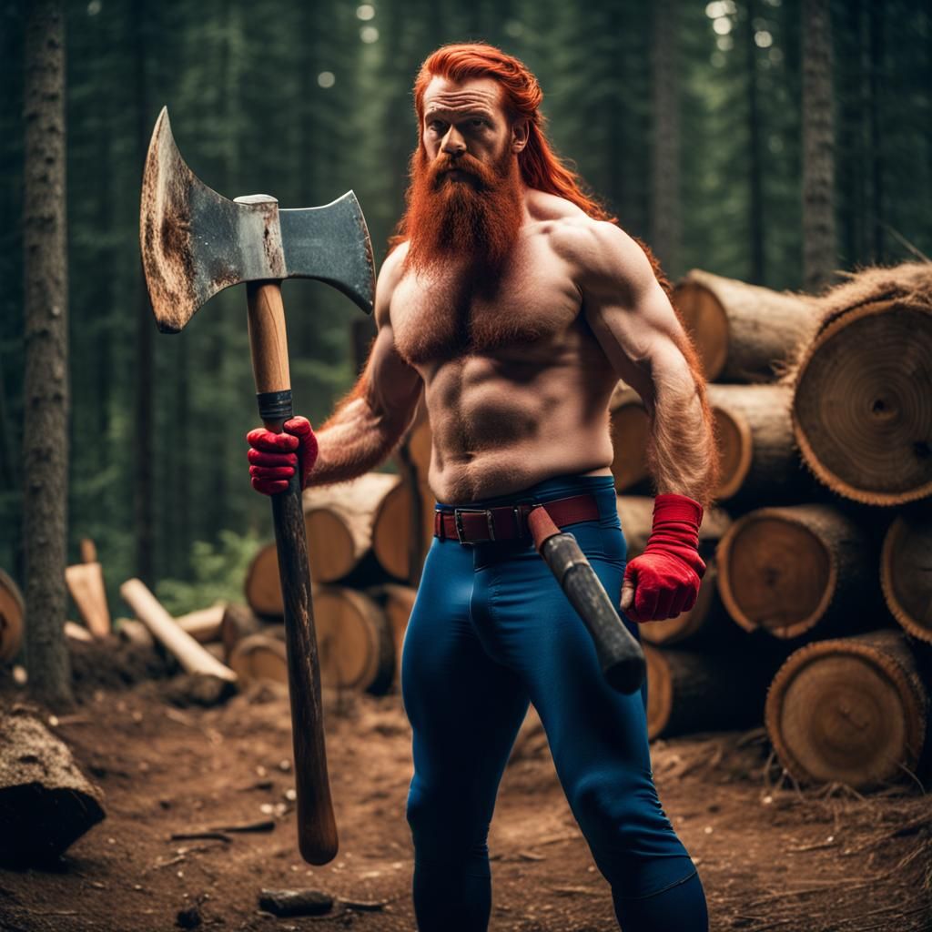 This image depicts a shirtless, muscular lumberjack with a red beard and long red hair, wearing blue lycra pants and holding an axe. The image has cinematic qualities.