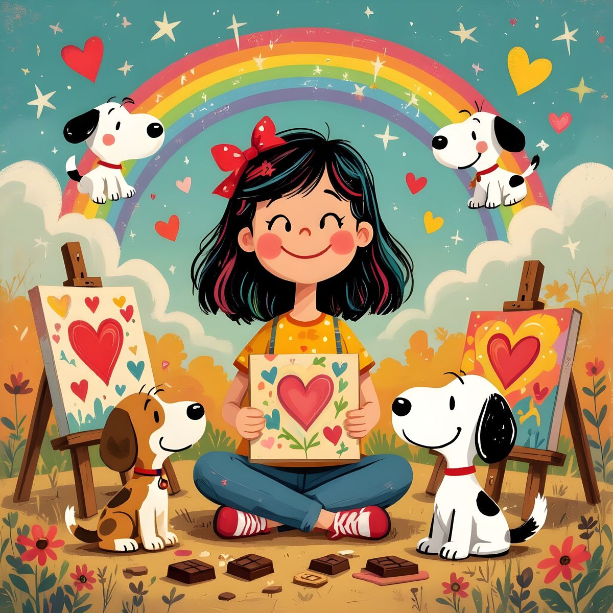 A smiling girl with vibrant hair and dogs paint hearts while flying dogs soar against a bright rainbow. Features scattered chocolates and Snoopy, with pastel colors and expressive brushstrokes.