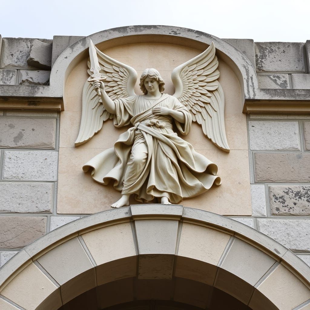 This image shows a stone archway featuring a carved relief of Archangel Michael holding a flaming sword, presented in a classical sculpted style.