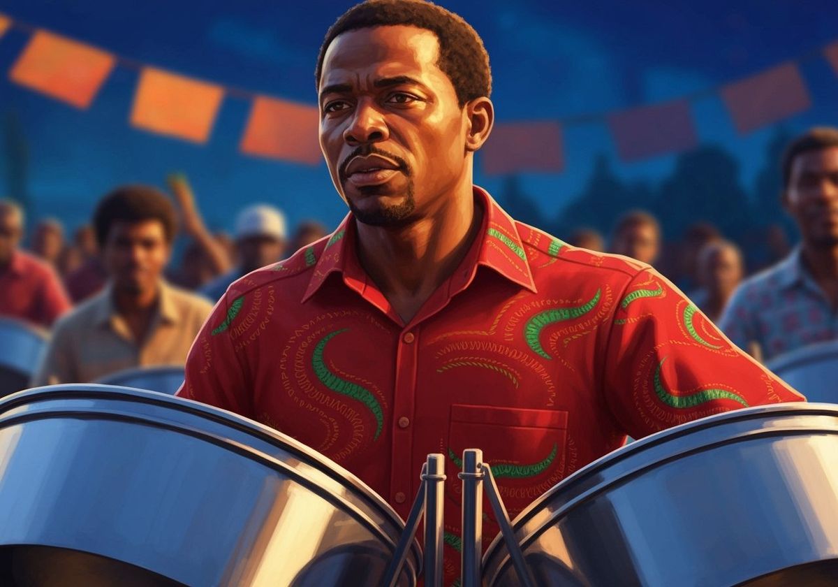 This image shows a Caribbean musician playing steel drums at a festival. The digital art uses complementary colors and intricate detail to capture the vibrant atmosphere.