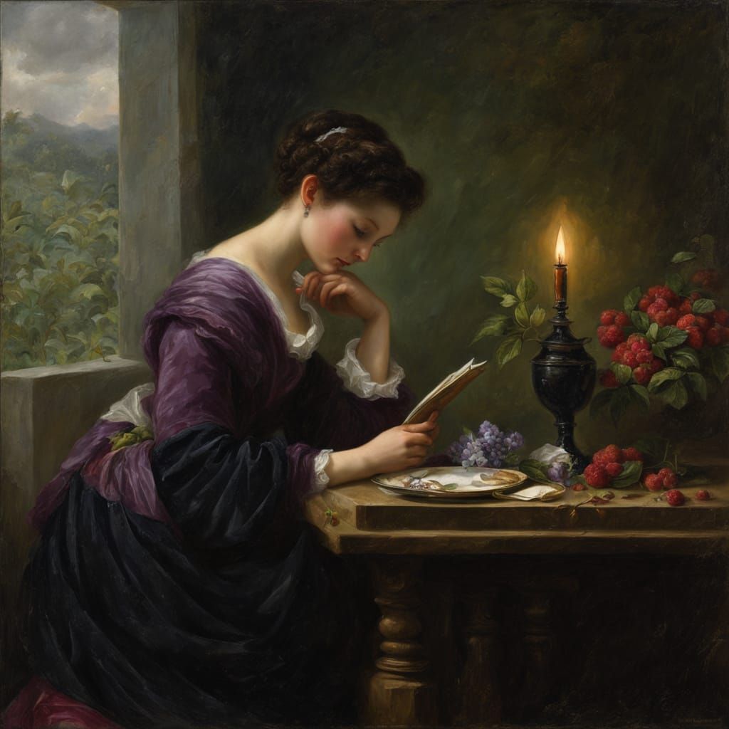 Was trying for a woman reading a book, but this looks more like a letter. Well, other attempts involved a woman who seemed more interested in eating raspberries...