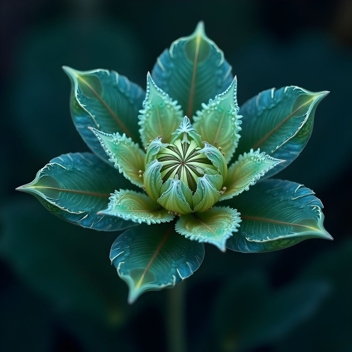 This image shows a fantasy flower with lace-like petals in shimmering blues and greens. The flower glows softly with dark green leaves, rendered with a vibrant and dreamlike aesthetic.