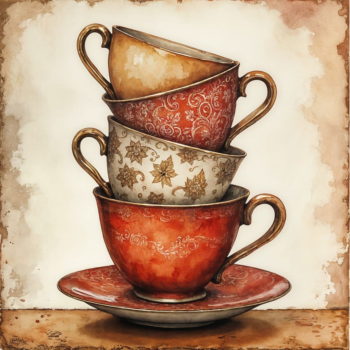 This image shows a stack of vintage teacups with red, cream, beige, and brown patterns. The watercolour evokes a magical fantasy scene, presented as neo-impressionist expressionist painting.