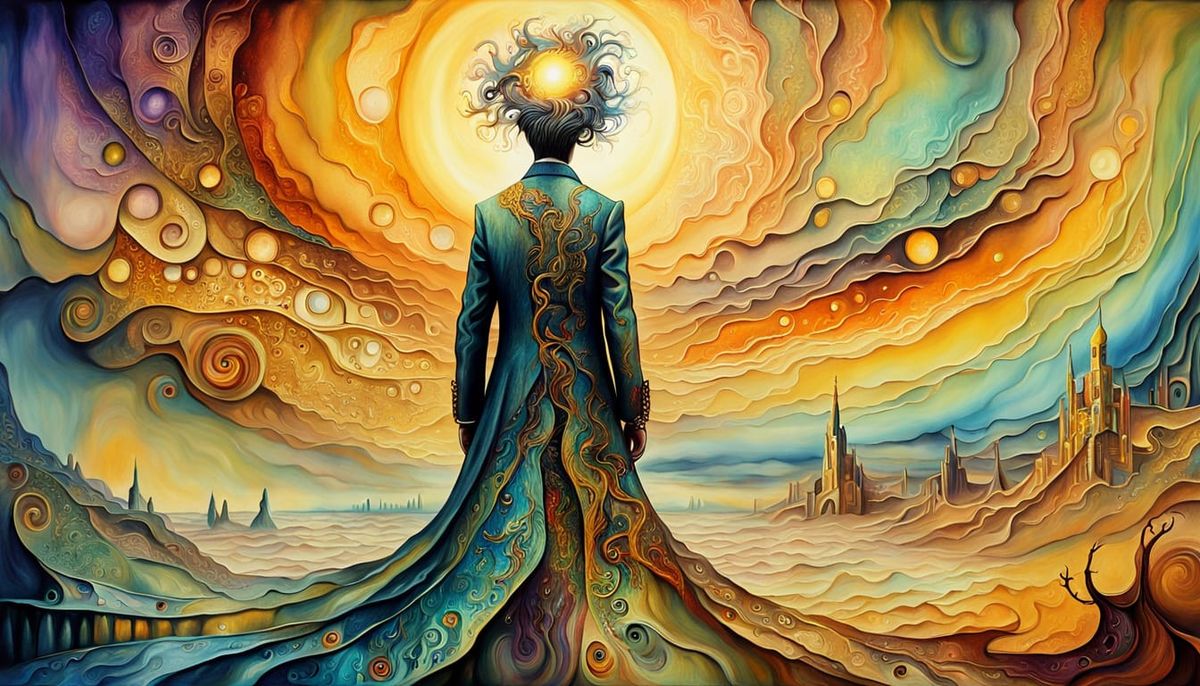 A surrealist painting of a solitary figure. The close-up composition and warm lighting enhance the artwork's emotional depth. The piece features soft pastel colors and intricate details in a dadaist art style.