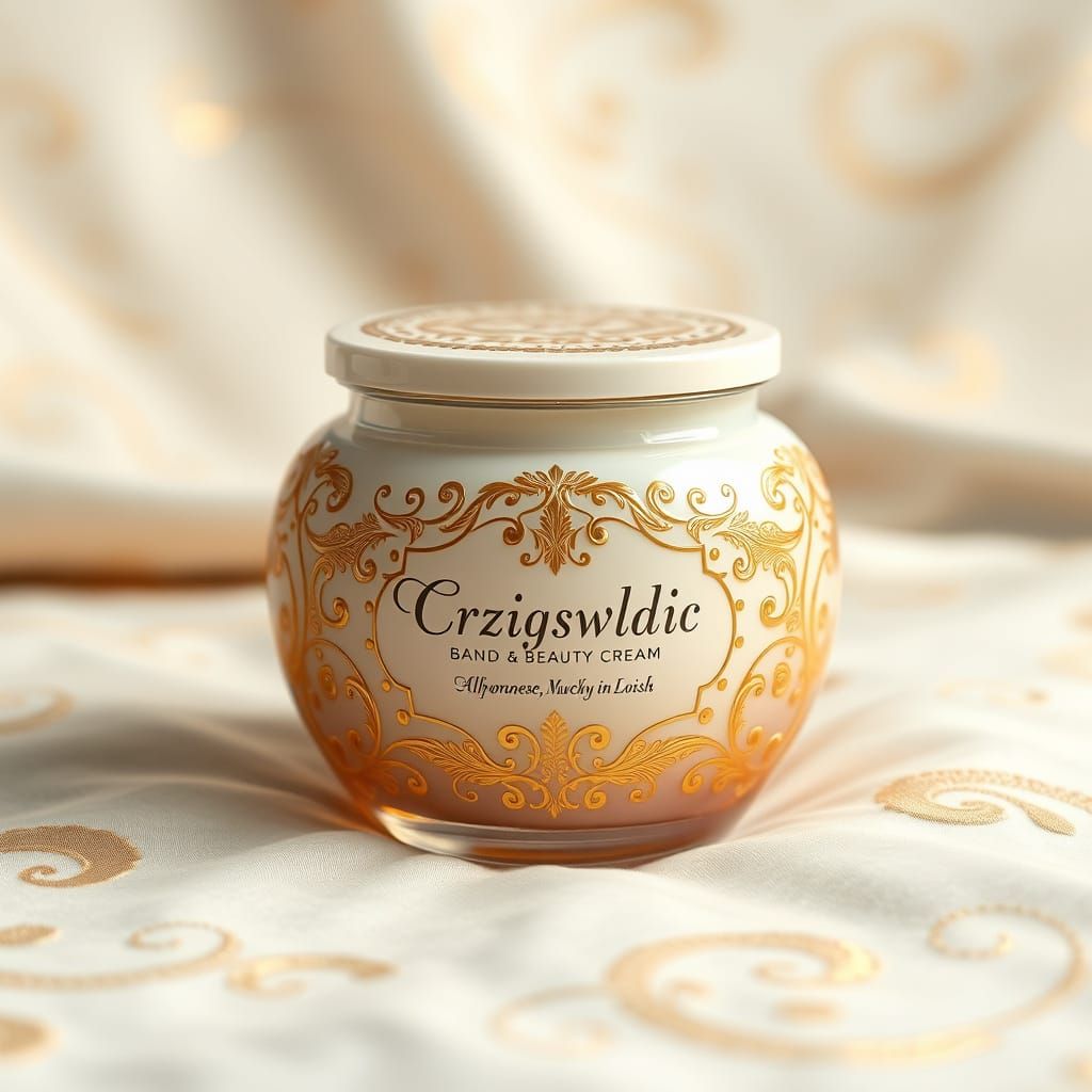 A beautifully crafted jar of high-end beauty cream, adorned with intricate golden filigree and soft pastel hues, in a style reminiscent of Alphonse Mucha's Art Nouveau elegance