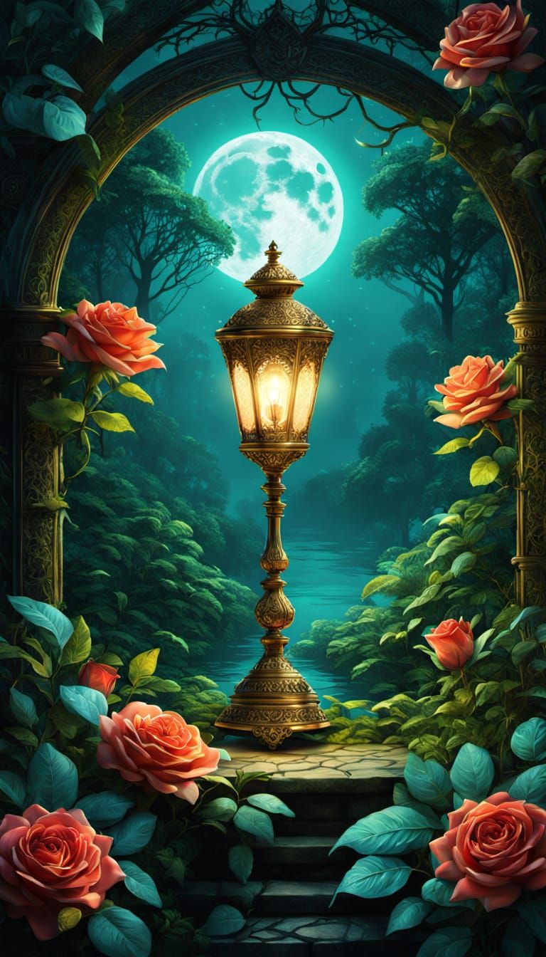 This digital painting captures a serene young man holding an ornate golden lamp amidst a lush fantasy forest. Soft teal moonlight and red roses create a mystical, painterly atmosphere in this magical realism style artwork.