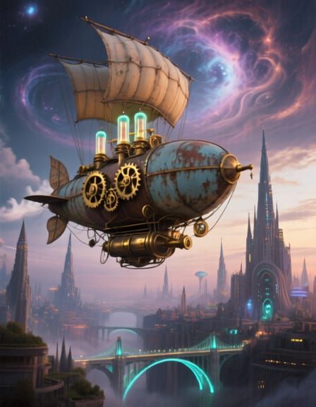 A vintage steampunk airship with brass gears navigates a nebula-filled sky. Below, a fantastical city with spires and bridges is rendered with dramatic lighting and ultra-detailed textures in a retro-futuristic style.