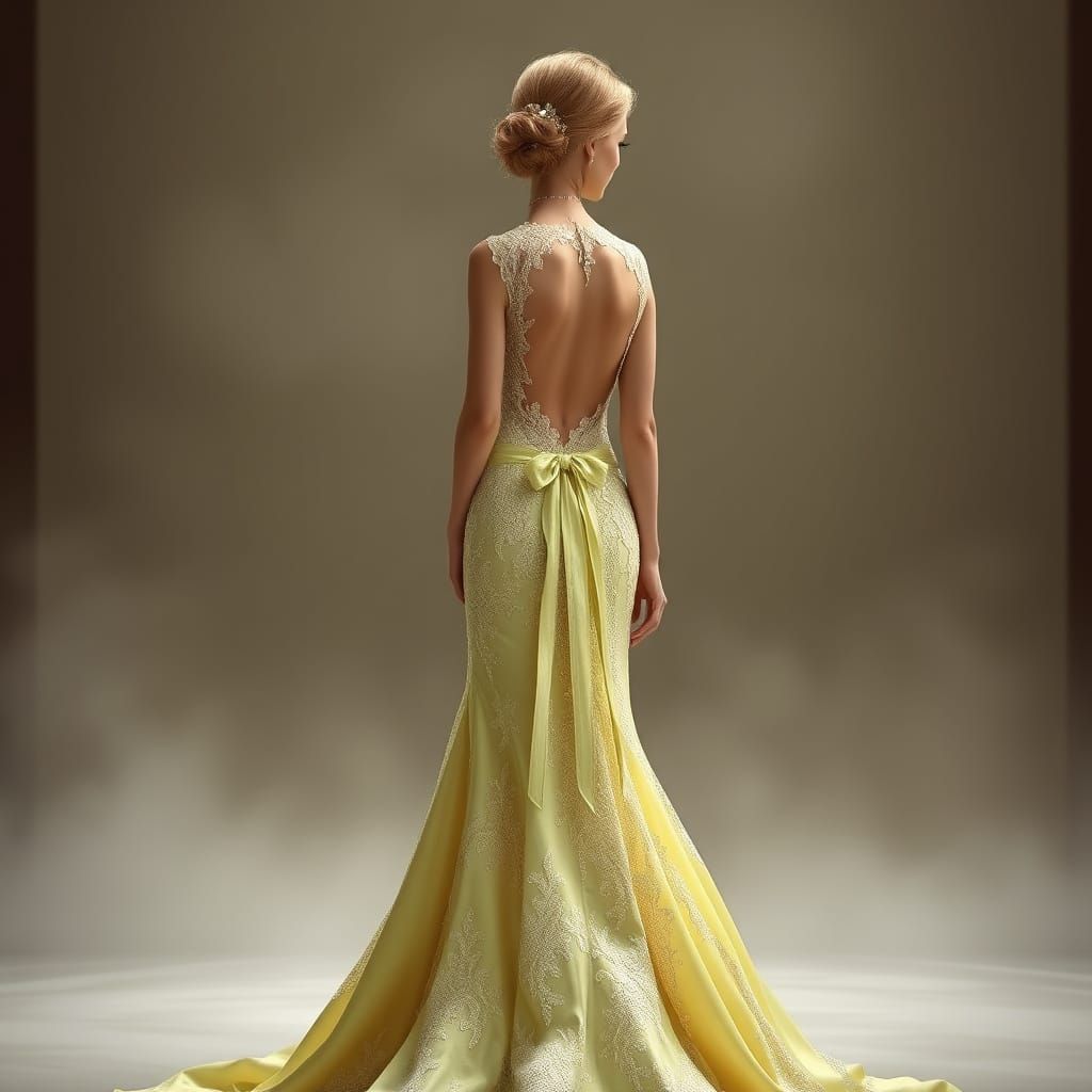 This captivating image features a stunning woman in a resplendent lemon and lime silk wedding dress with a daring open back, complemented by a lavish full-length lace train and delicate lace ribbon. Rendered in meticulous matte painting style, the image transports the viewer to a fantastical realm with d...