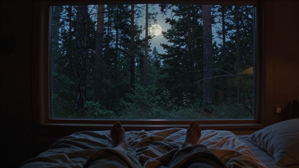 This image shows a cozy bedroom with a floor-to-ceiling window offering a view of a moonlit pine forest. The scene is captured with cinematic lighting and film grain for an atmospheric, realistic feel.