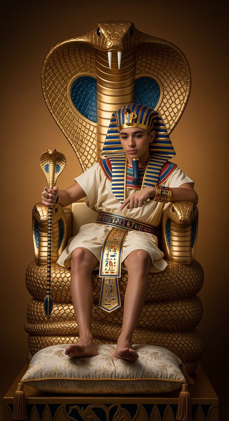 This image shows a youthful Egyptian pharaoh lounging on an ornate golden throne shaped like a cobra. He is depicted in a short toga with hieroglyphs, cobra crown, and scepter, captured with professional photography techniques.