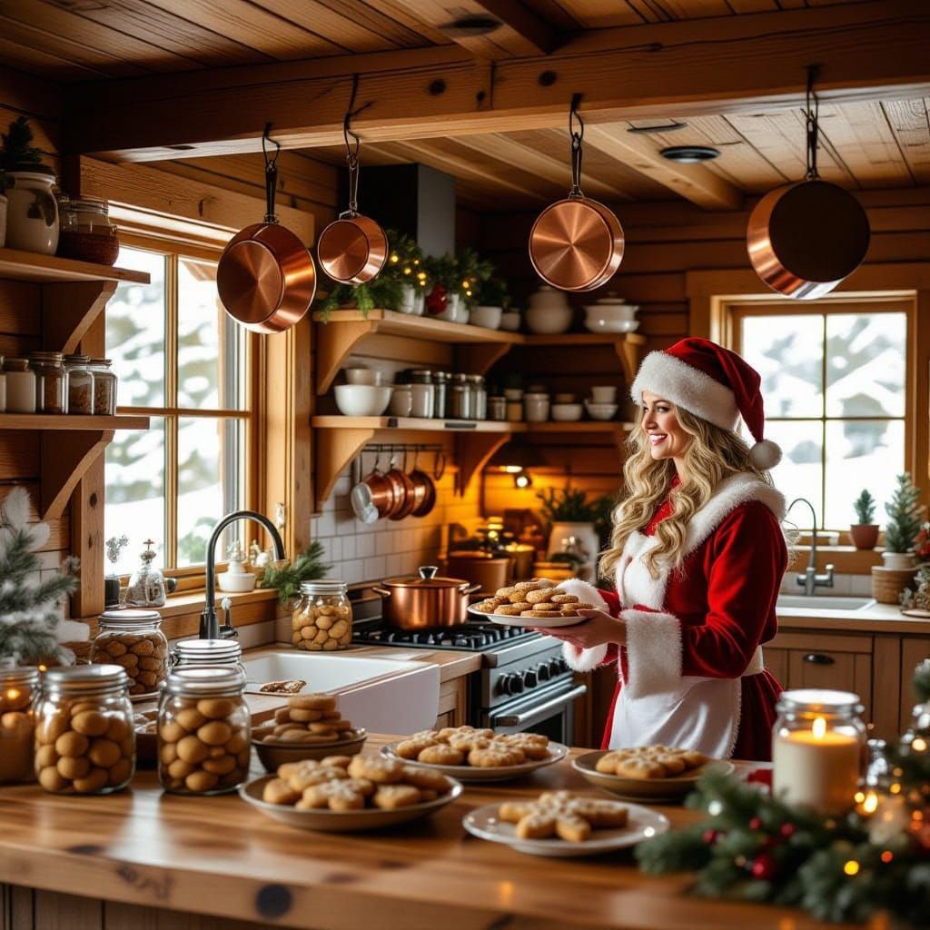 A hyperdetailed, wide-angle photograph captures Mrs. Claus' kitchen in Santa's Nordic cabin. Wooden shelves are filled with cookies and gingerbread, with warm ambient light creating soft shadows.