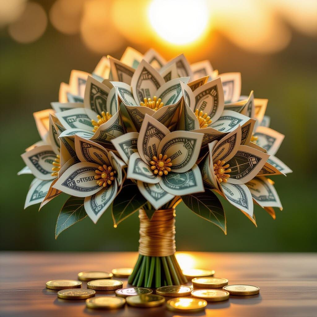 This image showcases a unique bouquet made from folded currency, with polished coin stems. Rendered in hyperrealistic digital painting style with warm golden hour lighting.