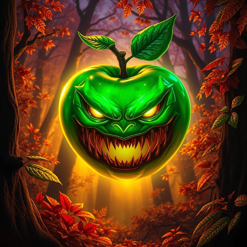 This captivating image depicts a glowing green apple with a menacing expression, suspended in a mystical forest bathed in warm, golden light. The atmosphere is charged with foreboding, as vibrant, clashing hues of golden and crimson leaves contrast with the apple's deep emerald green, evoking an Unreal E...