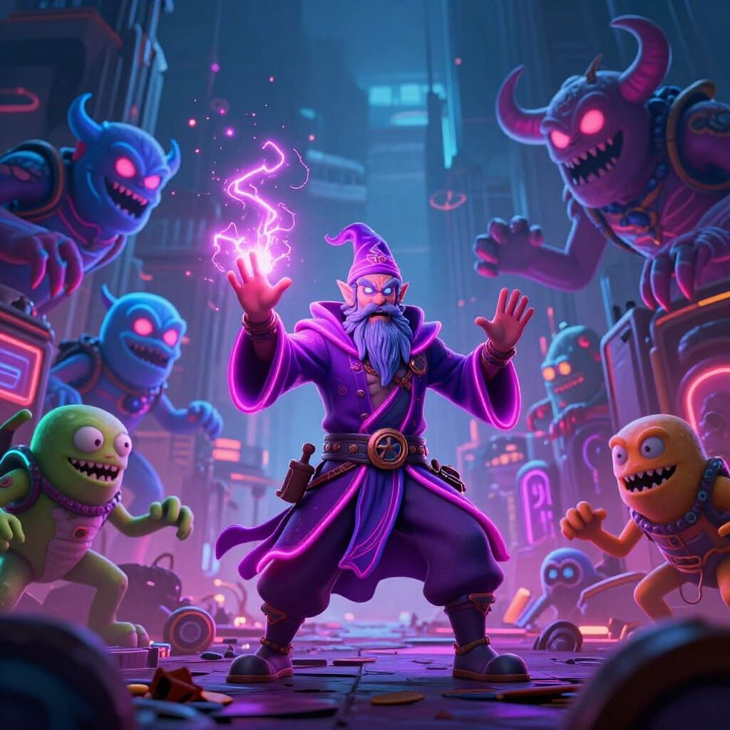 This image shows a wizard casting electric spells against neon monsters in a ruined city. Rendered with 3D game cinematic graphics, it features vibrant colors and dynamic lighting.