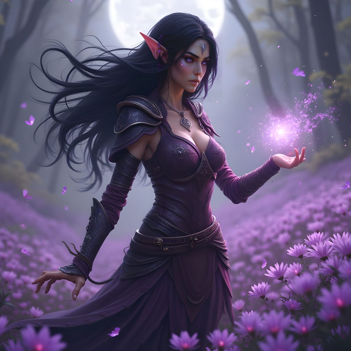 A striking picture of an elven warrior casting a spell in a field of purple flowers. The scene is rendered with dynamic lighting, hyperdetailed textures and vibrant colors for a digital art aesthetic.