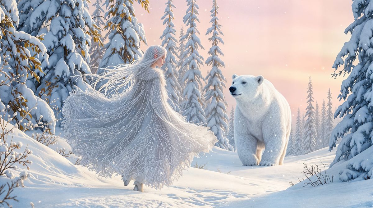 This image depicts a serene snow elf gliding through an enchanted forest, accompanied by a majestic polar bear, amidst a soft pink pastel sky and heavily snow-laden trees, rendered in exquisite 32K detail.