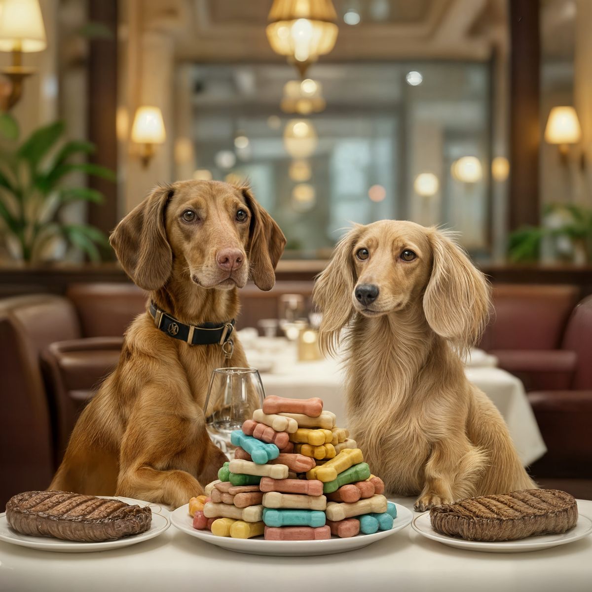 This image features a Pharaoh hound and a long-haired dachshund, both with light tan fur, seated at a restaurant table, ready for dinner.