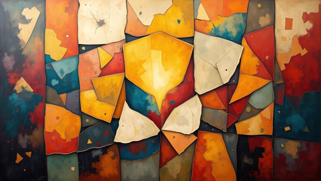 This image portrays abstract geometric shapes reforming into a crystalline structure. It features bright, optimistic colors and emanating golden light, symbolizing a fresh start. The style is abstract expressionism with bold color fields.