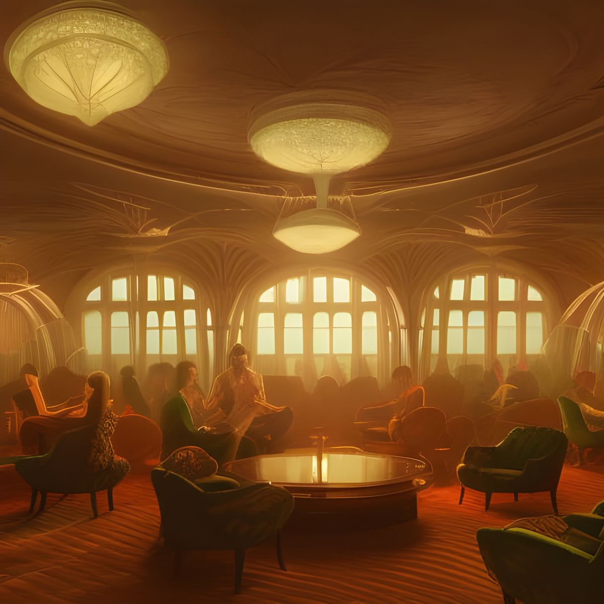 A view of an Art Nouveau ballroom lounge. This 8K resolution image features dynamic lighting and intricate detail with orange and teal coloring.