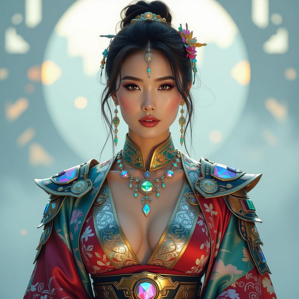 A striking picture of a woman with glowing skin wearing detailed Asian silk clothing and futuristic armor. The image is set against a misty backdrop with geometric shapes in a hyperrealistic style.