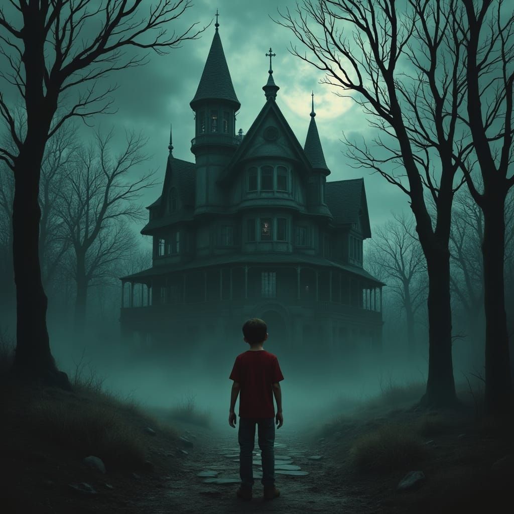 This image shows a solitary young boy standing before a dilapidated gothic mansion under a stormy sky. The scene is reminiscent of dark, biomechanical art, with eerie light and mist.