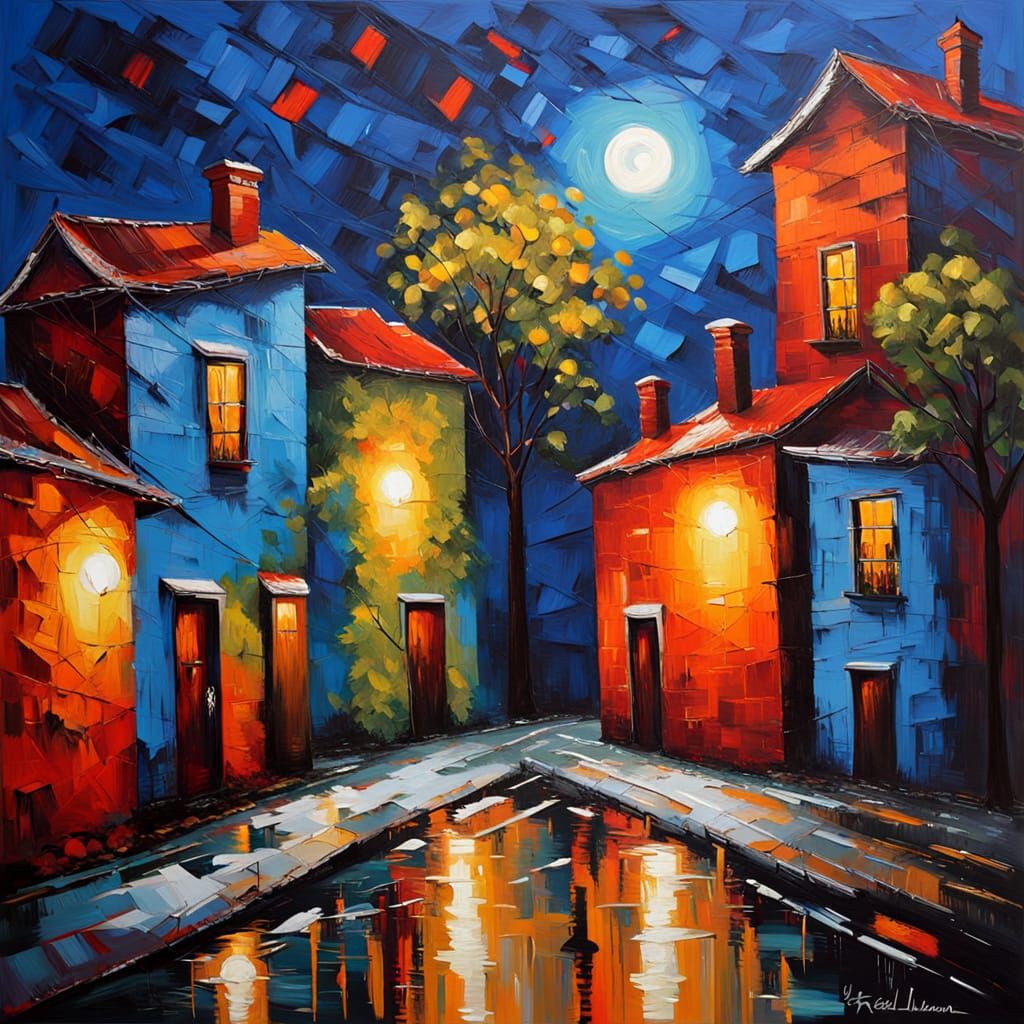 This impasto oil painting showcases a coastal village at night. Cobblestone streets and old houses lead to the sea under a vibrant, indigo sky, illuminated by soft moonlight.