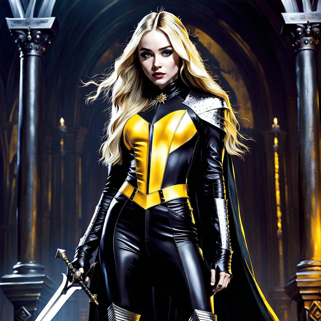 A captivating image of a young woman as a fantasy warrior. She wears a black leather suit with yellow accents and wields a large silver sword, rendered with hyperdetailed digital painting techniques.