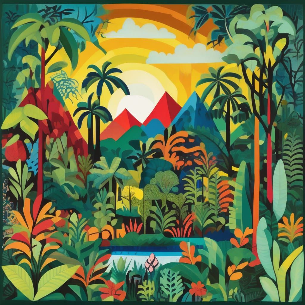 This image presents a vibrant, mysterious jungle scene in a naive folk art style. It features abstract, flat forms and patterns, reminiscent of Rousseau's distinctive approach to nature.