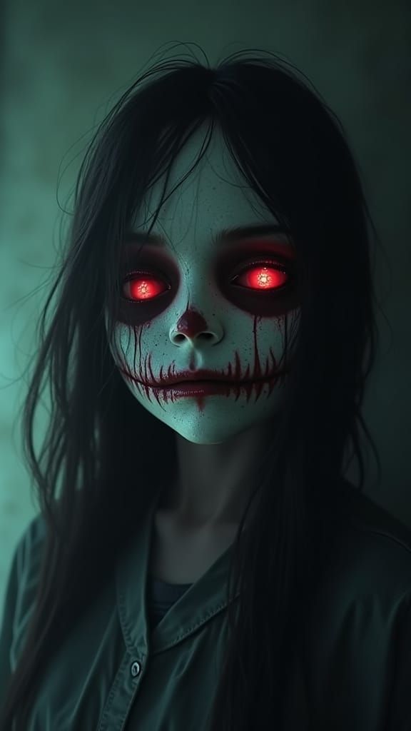 This image shows a terrifying haunted nun in a decrepit hospital setting. The nun's pale face and empty black eyes are illuminated by a faint moonlight, creating a dramatic atmosphere. The 3D anime realistic style adds to the horror and eerie feeling.