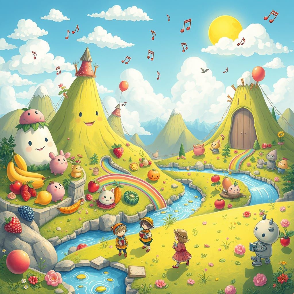 A whimsical fantasy landscape filled with candy creatures and rainbow rivers. This vibrant image features smiling mountains and animal-shaped clouds in a pastel color palette, reminiscent of anime art.
