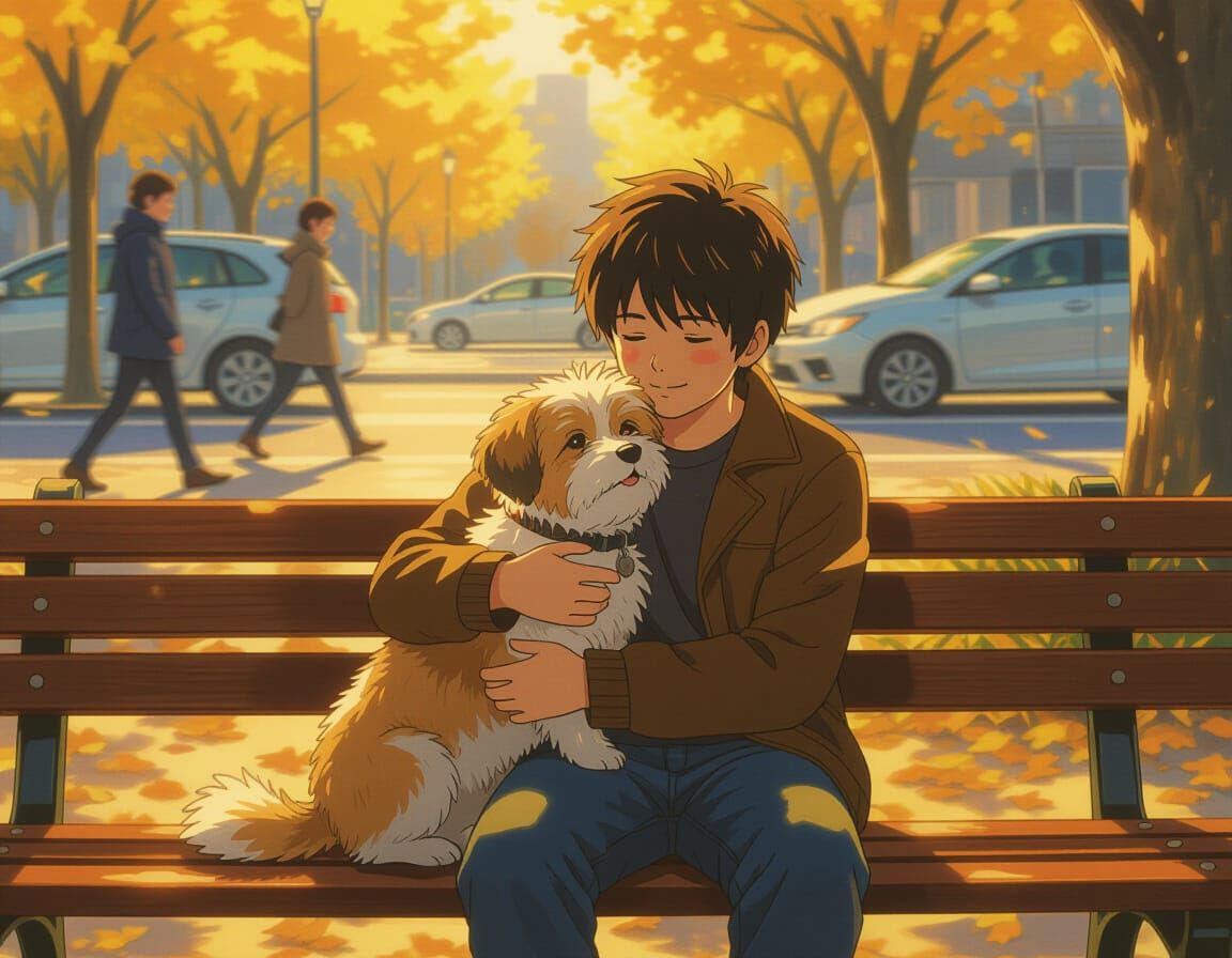 This image captures a tender moment between a boy and his shaggy dog on a park bench, bathed in golden light. It contrasts their stillness with a blurred, fast-moving background, evoking emotional storytelling.