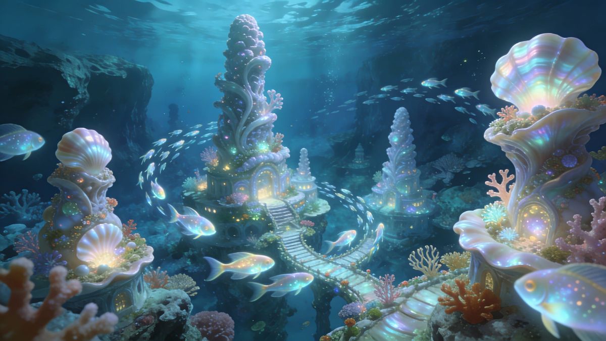 This image depicts a fantastical underwater city built from glowing plants and mother-of-pearl. Schools of luminous fish swim through organic spires in a whimsical, ethereal style.
