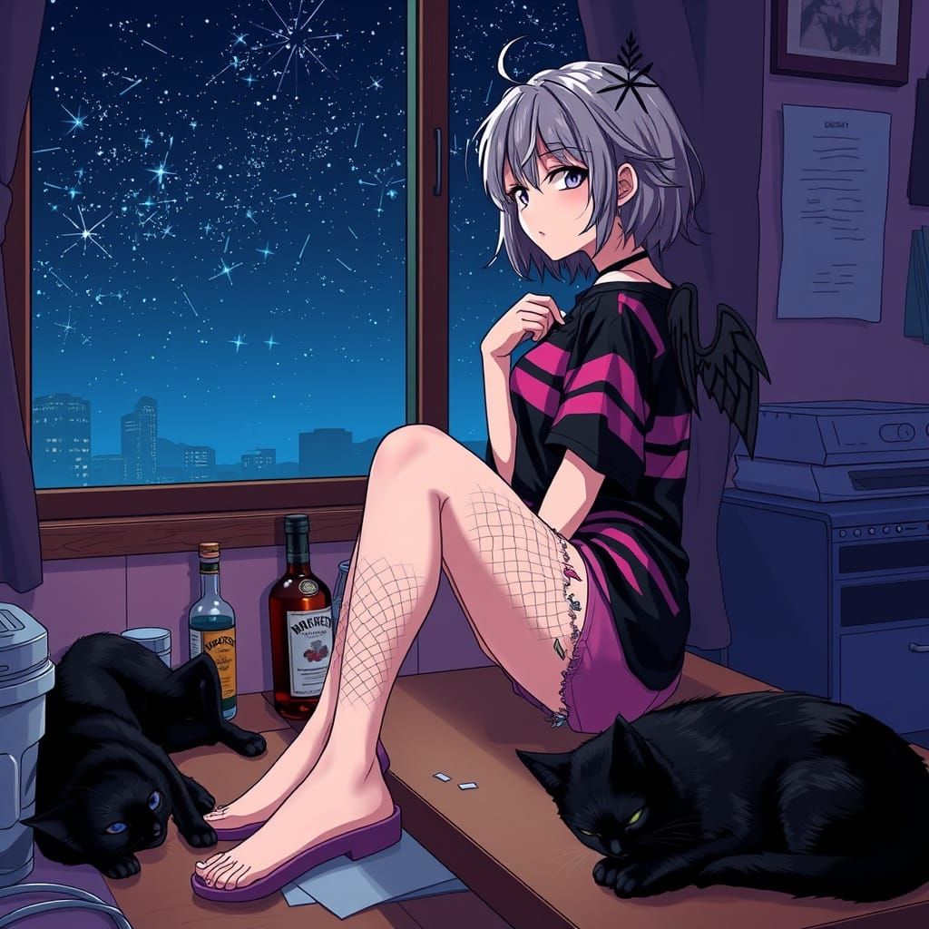 This image features a young woman with short, tousled hair, a collarbone tattoo, and delicate black wings, sitting on a cluttered table amidst a dark, starry night sky with electric blue hues. Rendered in a bright, saturated anime style with deep colors and bold lines.