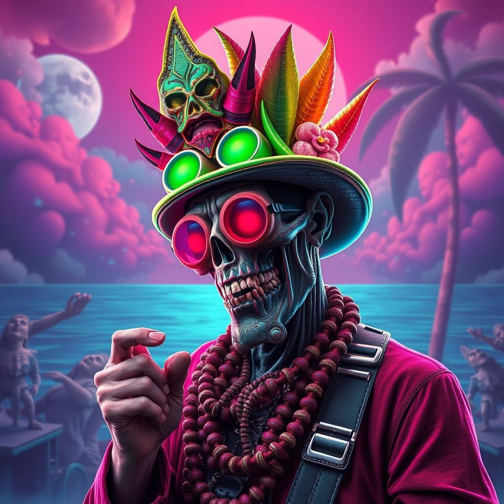 This image shows a vibrant portrait of legendary musician Buddy Guy in the style of Arcimboldo, set against the backdrop of a neon-lit Caribbean island at night. The artwork combines the musician's iconic style with the dreamy, synthwave aesthetic of a tropical paradise.