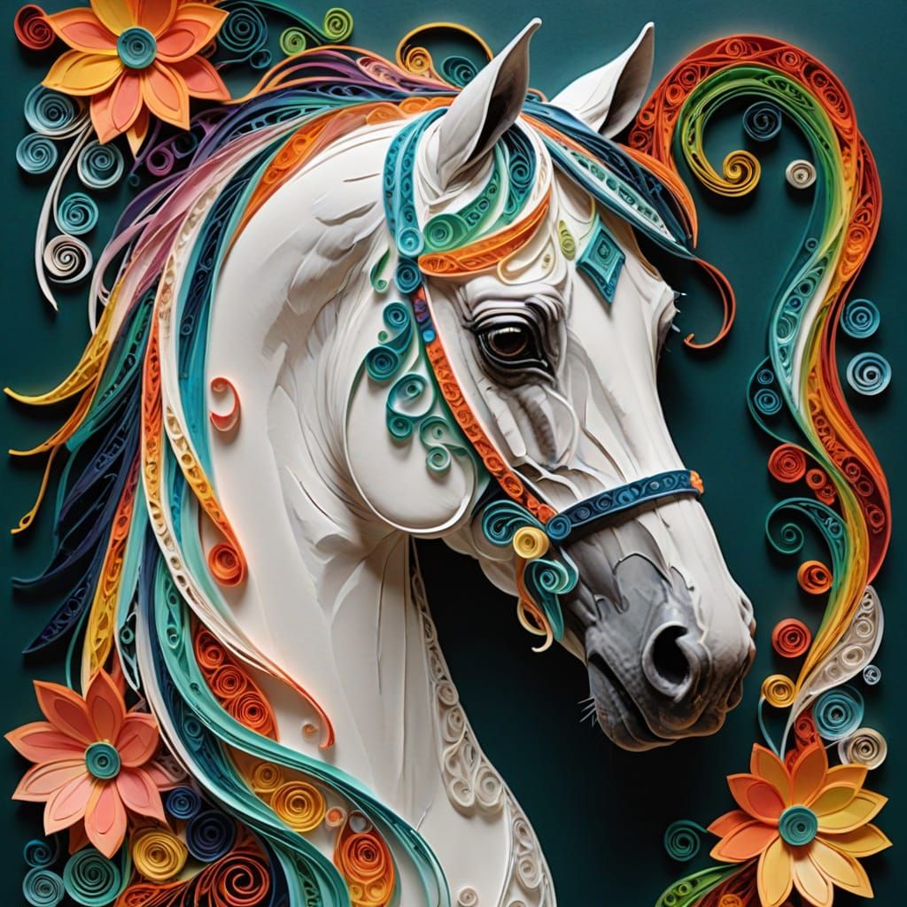 "image is a close-up, portrait-style depiction of a horse's head and neck, rendered in a distinctive style resembling paper quilling. The ho... 3.2/5 N=6,126 (DC: NTT)