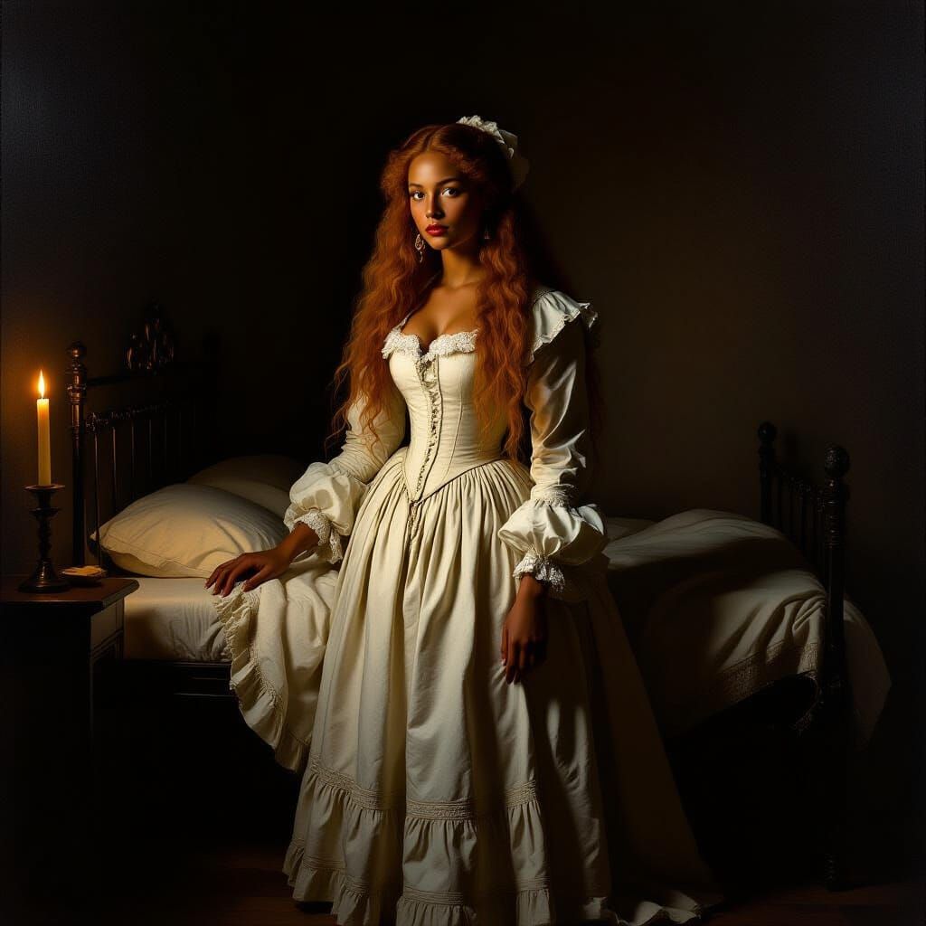 A slender Black woman in early Victorian attire stands by a bed, illuminated by a single candle. The scene captures dramatic chiaroscuro lighting, reminiscent of Dutch Golden Age paintings.