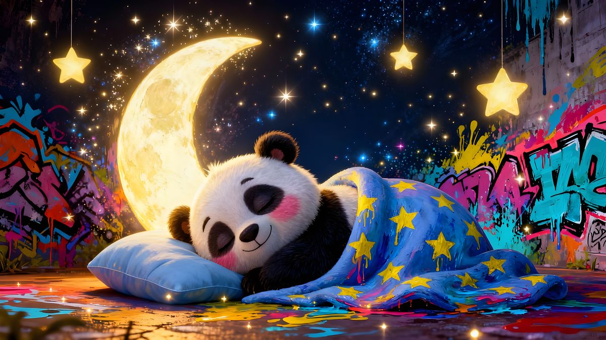 This image features a 3D animated panda sleeping peacefully under a glowing moon and stars. The scene is calm, warm, and dreamy with magical twinkling lights, rendered in a hyperrealistic, colorful style.