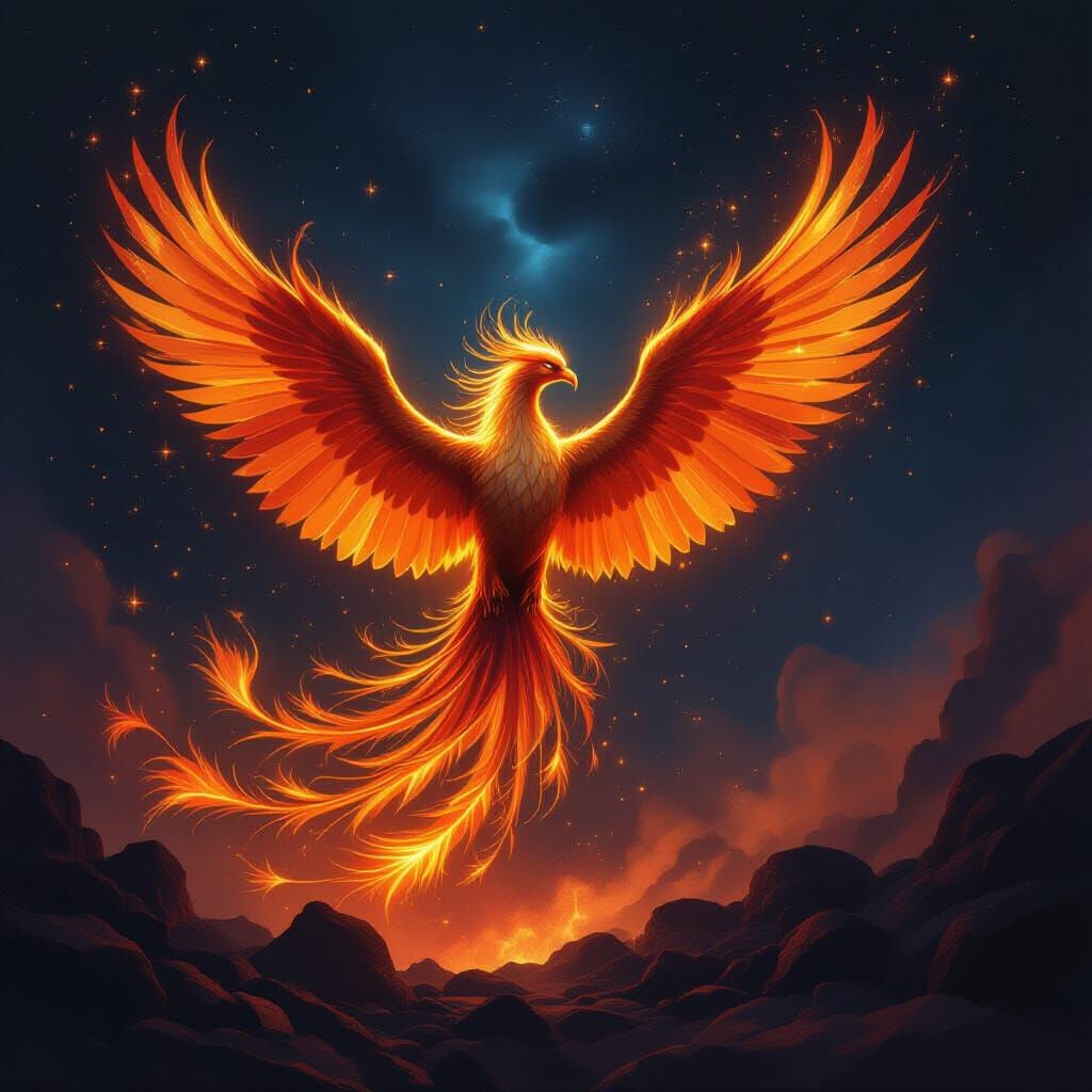 This image shows a majestic phoenix made of gold and fire emerging from a cosmic nebula. Rendered with dramatic light and shadow, it features vibrant colors and intricate detail, evoking epic fantasy art.