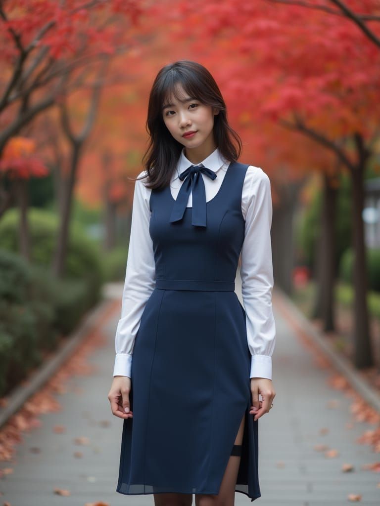 A full-body cinematic portrait of a young woman in a navy jumper dress with a tight skirt and high-heeled loafers, posing in front of a shrine office during autumn with red leaves.