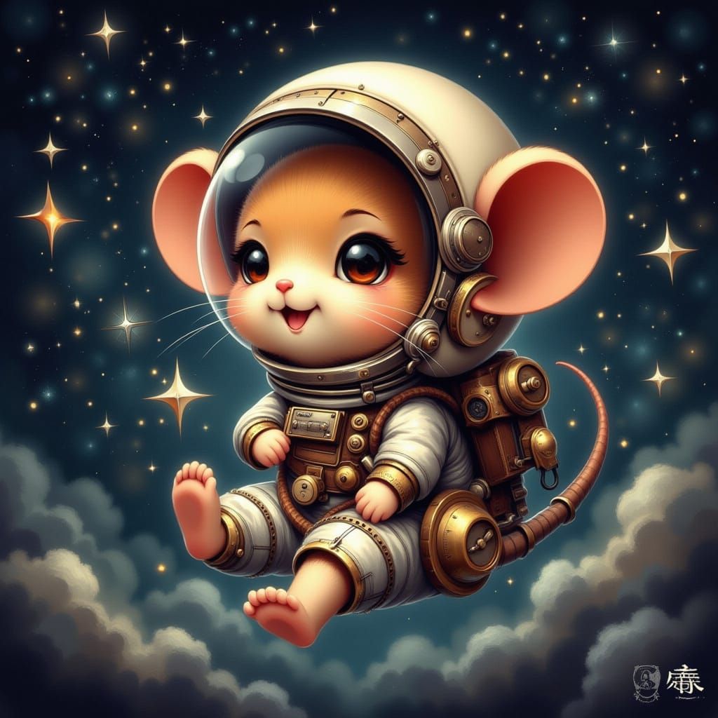 This image shows a cute, chibified steampunk mouse astronaut in a detailed spacesuit, floating among stars. A digital illustration with a detailed background.