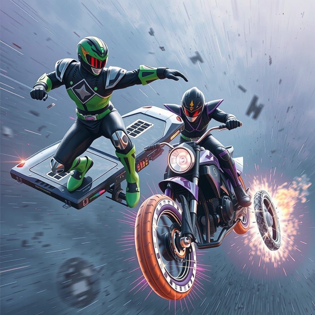 A dynamic image of a Green Psycho Ranger on a hoverboard in combat with a Purple Psycho Ranger on a flying bike. The scene is rendered with cinematic flair, intense action and dramatic lighting.