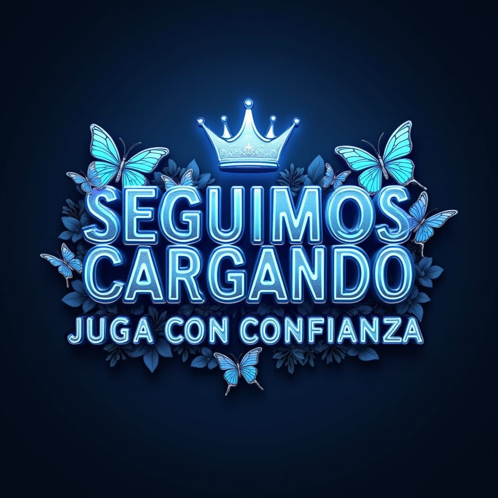 A futuristic 3D logo with the metallic words "SEGUIMOS CARGANDO" in large, shiny letters. Small white text and a bright blue crown appear above, with neon butterflies and poker chips around it, in blue and silver tones.