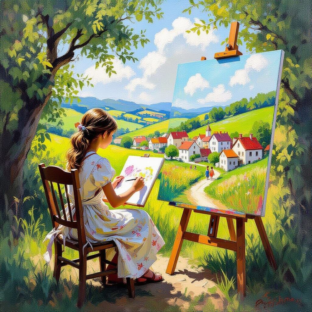 This image shows a girl painting a village scene. The artwork features grassy hills and tiny figures in a vibrant gouache style. It is reminiscent of impressionist paintings, with thick layers of impasto and watercolor.