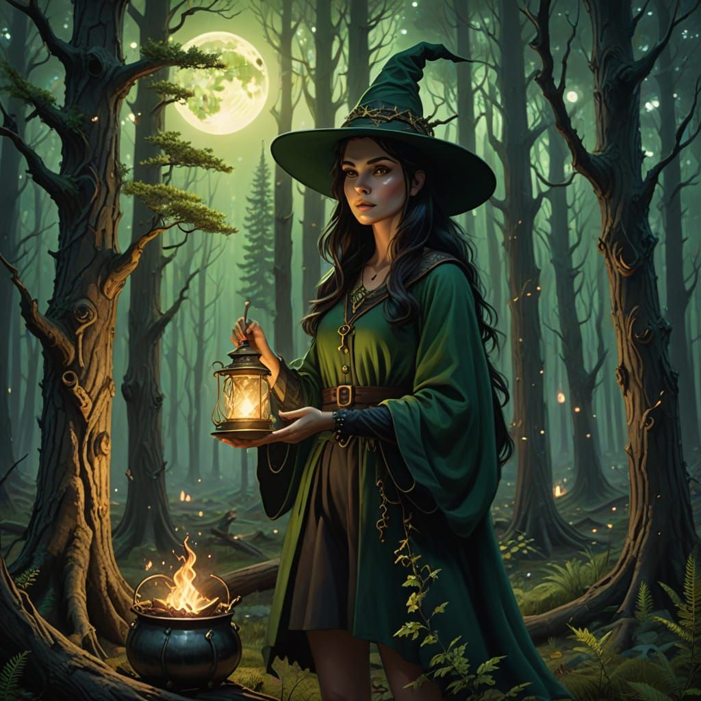 This image showcases a young witch in a deep green forest, holding a magic wand and an open spellbook. Cinematic lighting creates an ethereal glow around the enchanted scene.