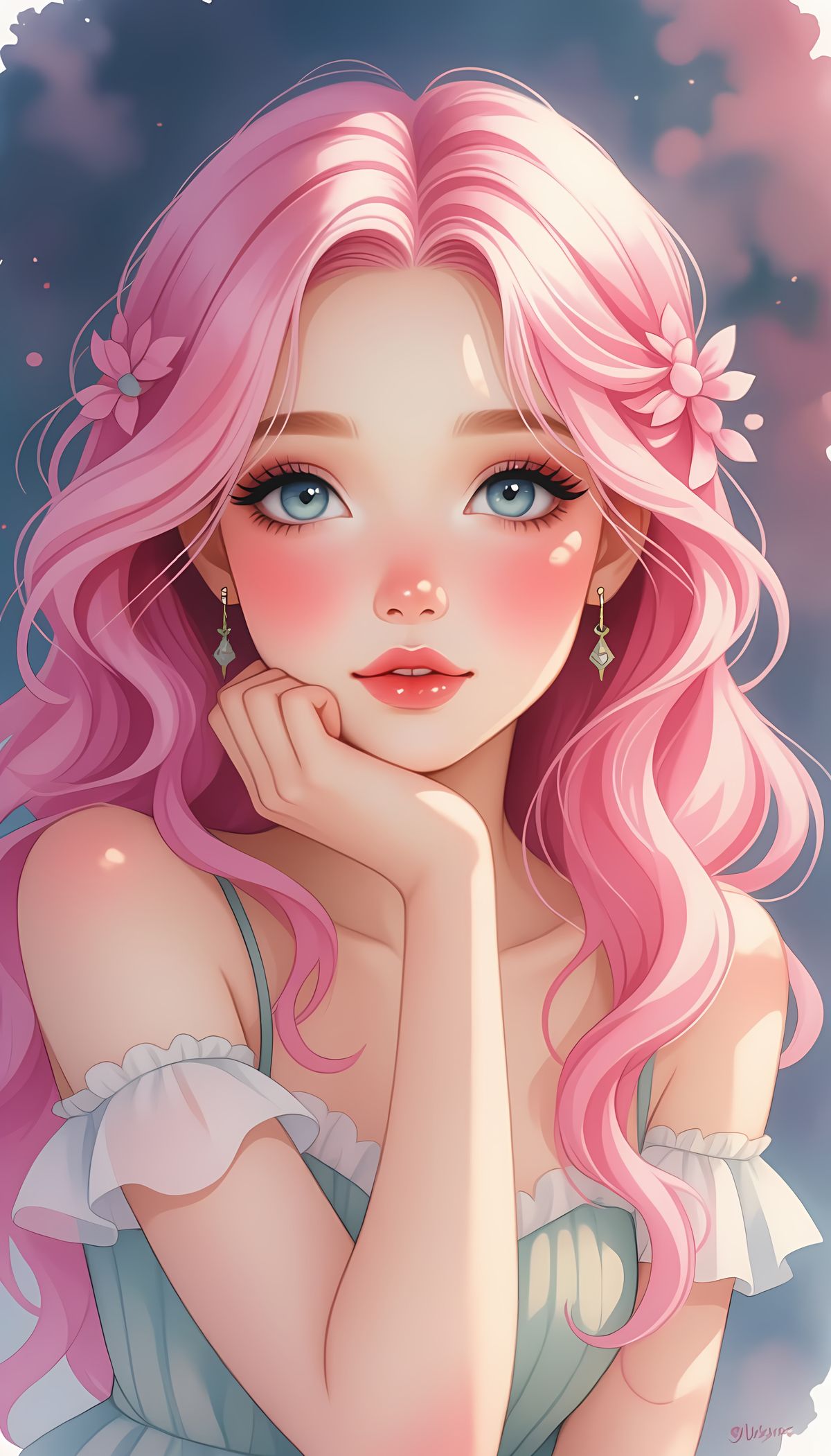 This image shows a stunning watercolor painting of a beautiful girl with captivating eyes and pink hair. The artwork evokes a fairytale aesthetic with masterful detail.