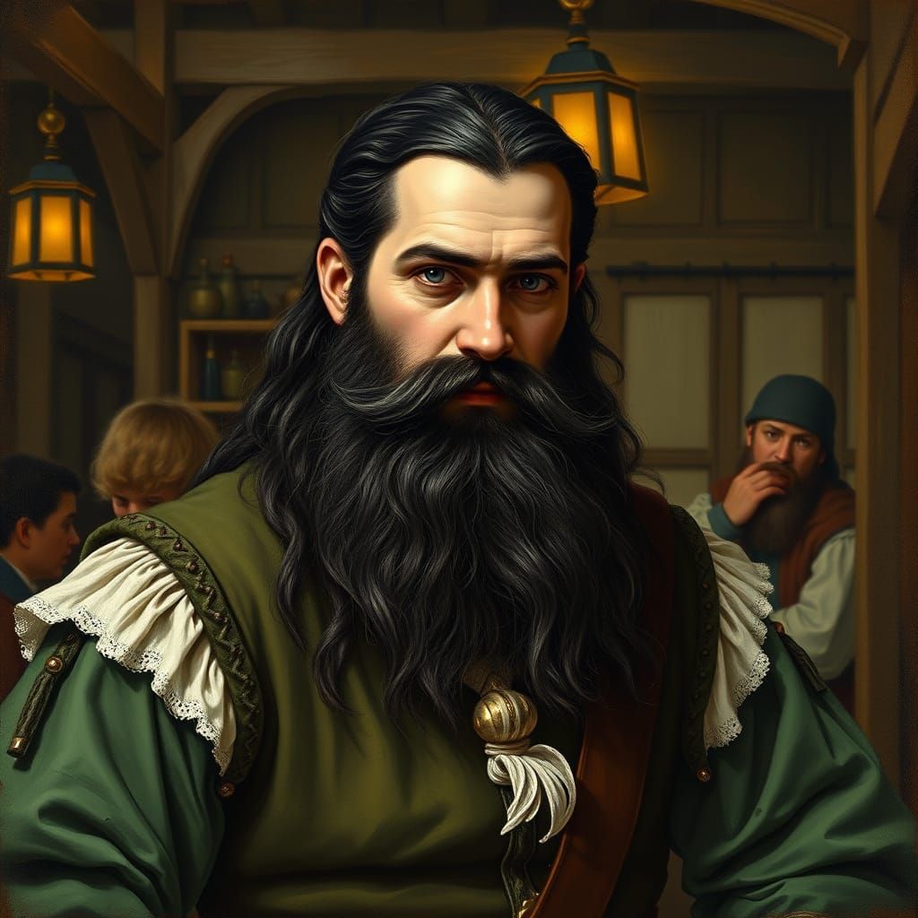 This image shows a renaissance man with a full black beard in a green hunter's dress, set within a renaissance tavern. The artwork evokes the feel of an oil painting.