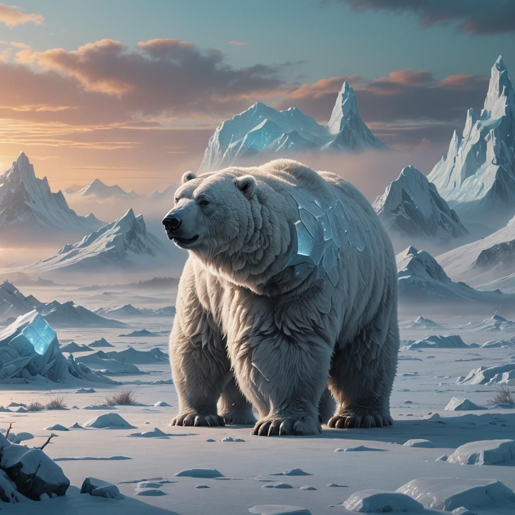 A majestic ice bear dominates a frozen tundra at dawn. The digital painting captures a cinematic scene with intricate details, glowing mist, and glistening ice crystals in surreal atmospherics.