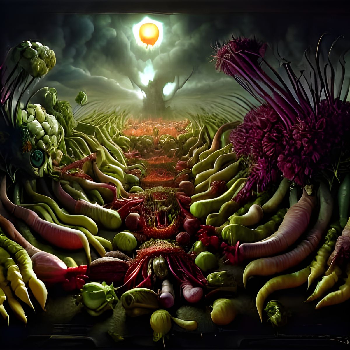 A striking picture of a battlefield filled with mutant vegetables engaged in a deadly fight. This stunning image features holographic and cinematic qualities with amazing depth of field.